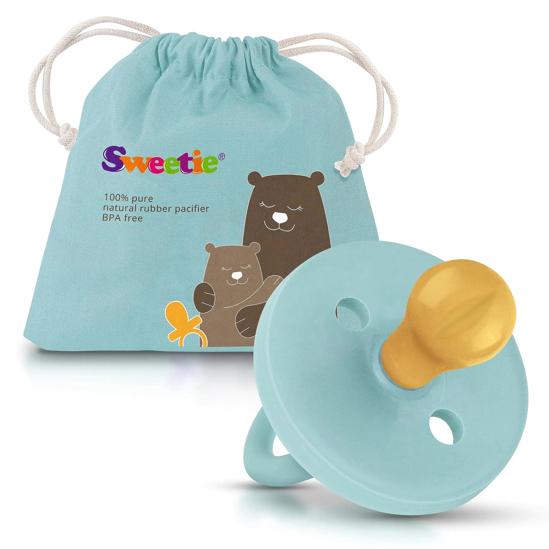 Sweetie 100% pure natural rubber pacifier. Soft and natural. Round nipple. 3 sizes. Made from 100% natural rubber from the Hevea tree. Hevea tree natural rubber is softer than silicone and won't leave marks on the baby's face. Uniquely hygienic and strong - made of one cast with no joints or cracks where dirt and bacteria can accumulate. No BPA, nitrosamines, PVC phthalates, chemical softeners, or artificial coloring.
